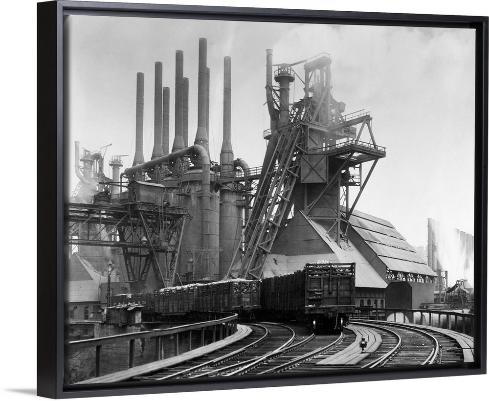 <p>Pittsburgh, PA. Blast furnaces of the Carnegie Steel Corp. Photograph shows an exterior of Steel Plant with smokestakes and railroad tracks. Undated Photograph.</p>