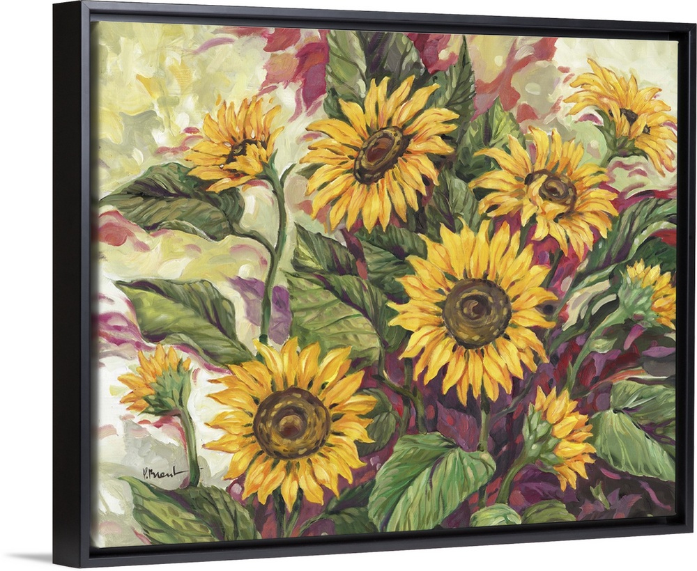 <p>Painting of an arrangement of sunflowers of different sizes.</p>
