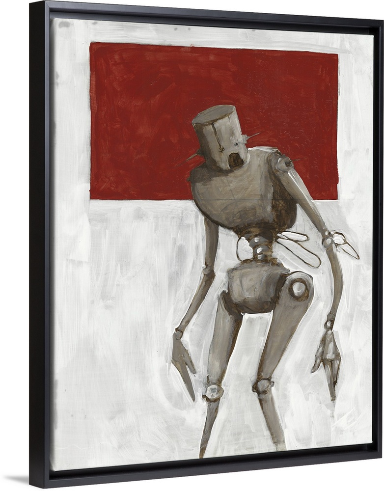 <p>Illustration of a thin grey robot standing in front of a red square.</p>