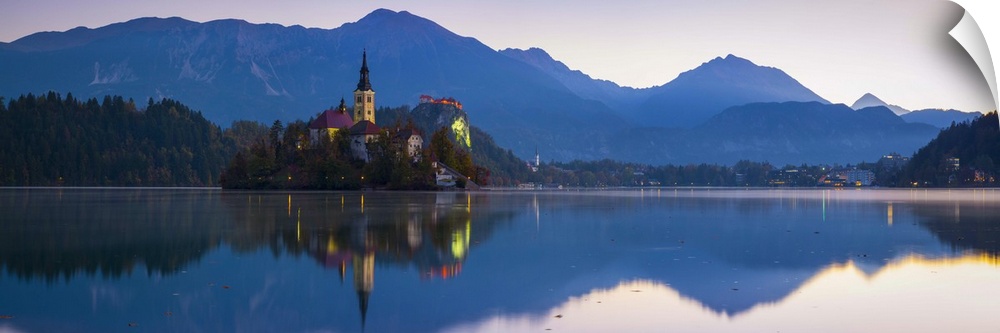 <p>Bled Island (Blejski otok) with the Church of the Assumption (Cerkev Marijinega vnebovzetja) illuminated at dawn, Lake Bled, Bled, Upper Carniola, Julian Alps, Slovenia</p>