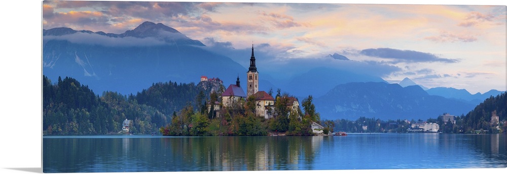 <p>Bled Island (Blejski otok) with the Church of the Assumption (Cerkev Marijinega vnebovzetja) at sunset, Lake Bled, Bled, Upper Carniola, Julian Alps, Slovenia</p>