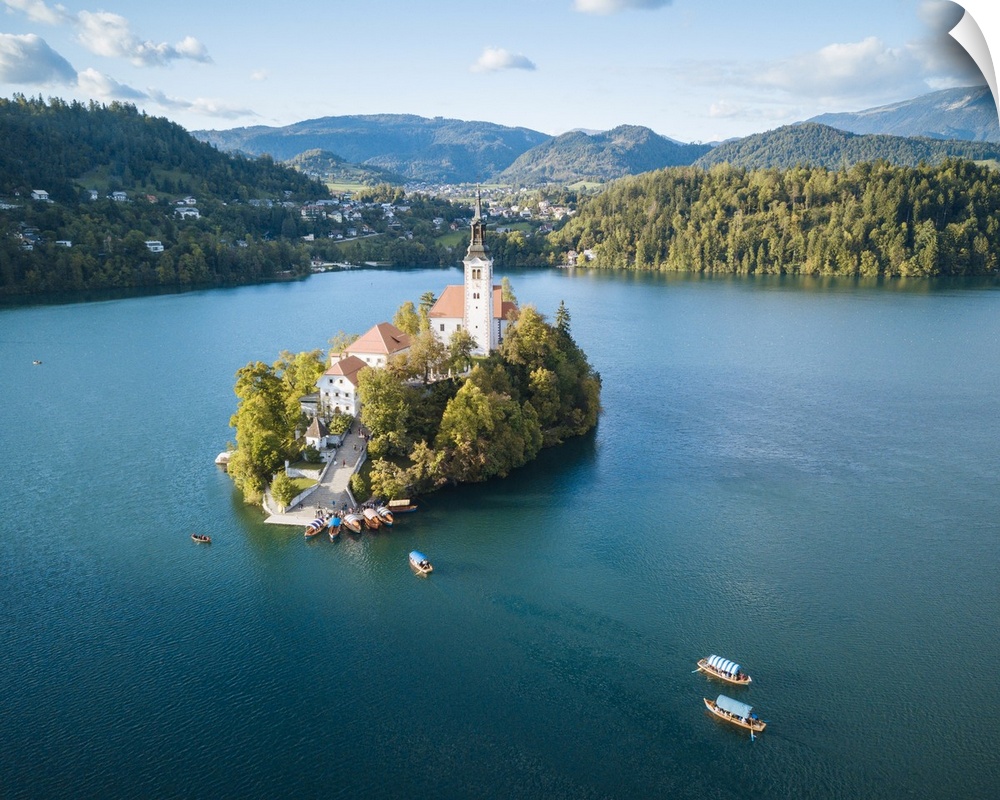 <p>Aerial view by drone of Bled Island with the Church of the Assumption at dawn, Lake Bled, Upper Carniola, Slovenia, Europe</p>