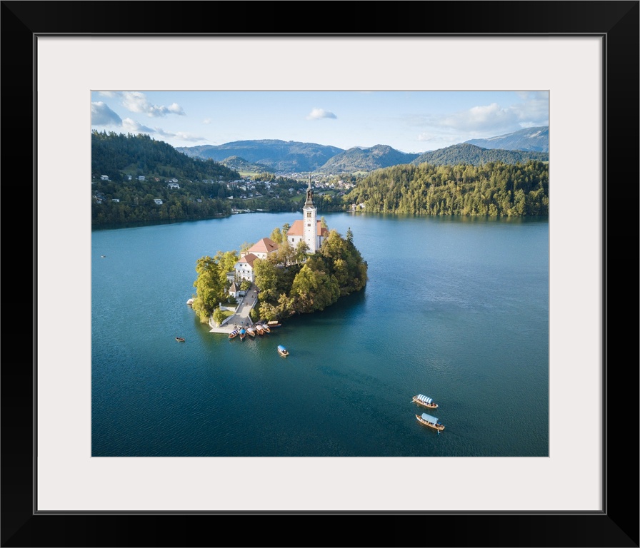 <p>Aerial view by drone of Bled Island with the Church of the Assumption at dawn, Lake Bled, Upper Carniola, Slovenia, Europe</p>