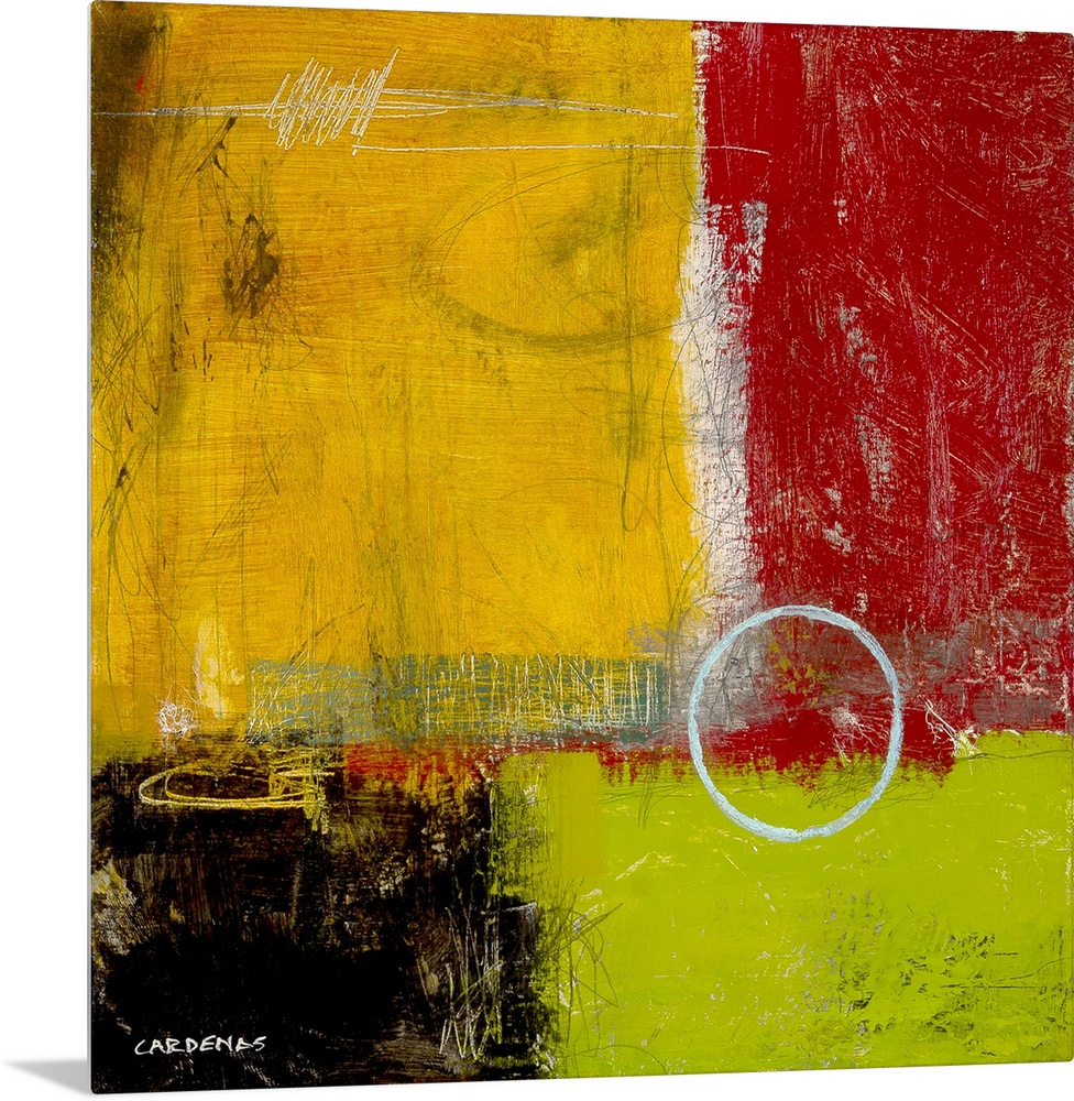 <p>Red, mustard, lime green and black abstract, square.</p>