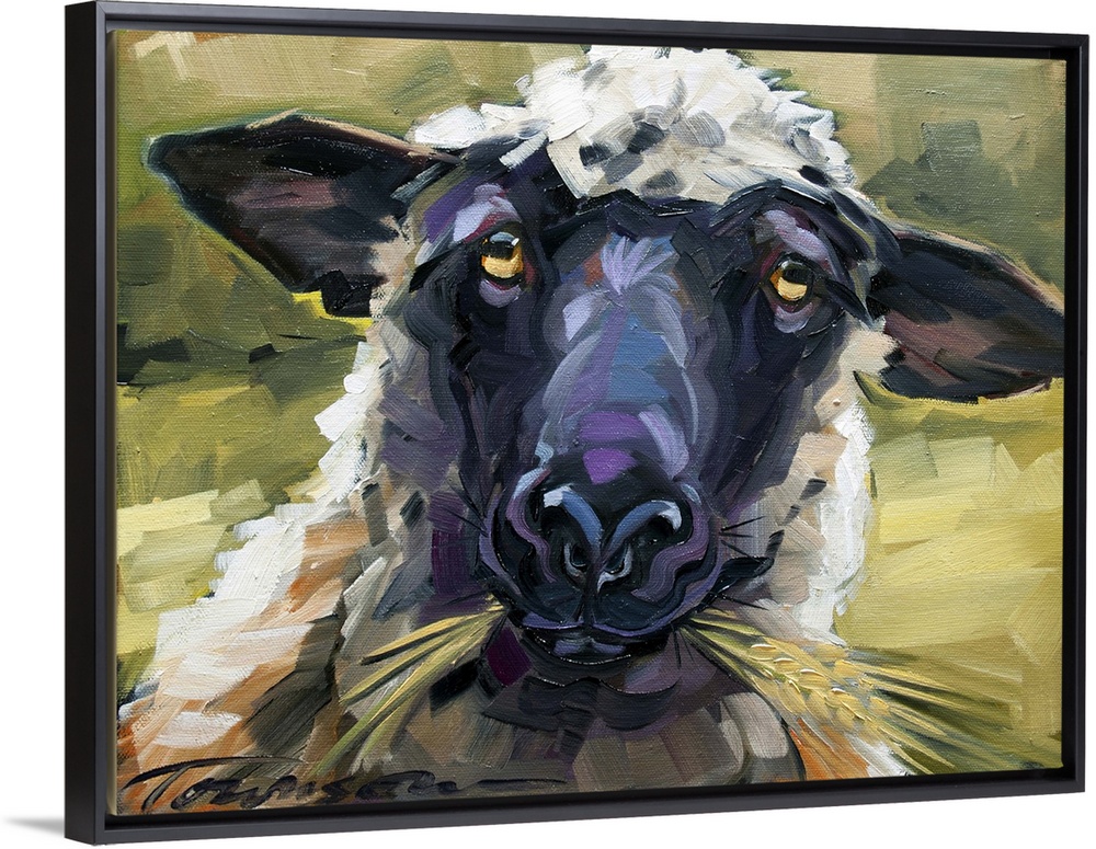 <p>Thick brush strokes create a humorous scene of a sheep's expression while eating.</p>