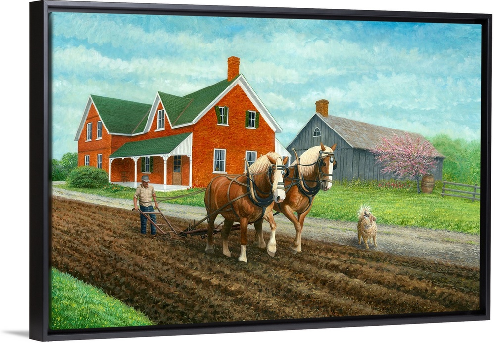 <p>Contemporary artwork of two horses pulling a plow in a field.</p>