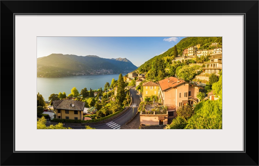 <p>Blevio, lake Como, Como province, Lombardy, Italy. The winding coastal road at sunset.</p>