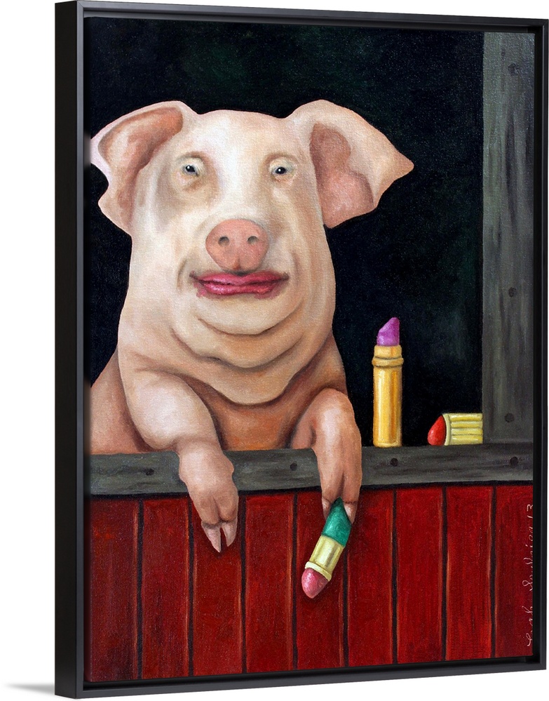 <p>Surrealist painting of a pig putting lipstick on.</p>