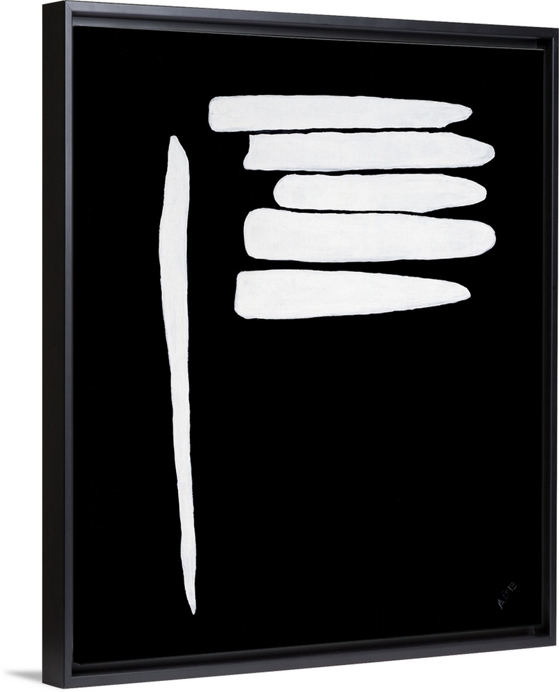 <p>Contemporary abstract painting that has a solid black background and thick white lines- one running vertically and the other five stacked on top of each other horizontally.</p>