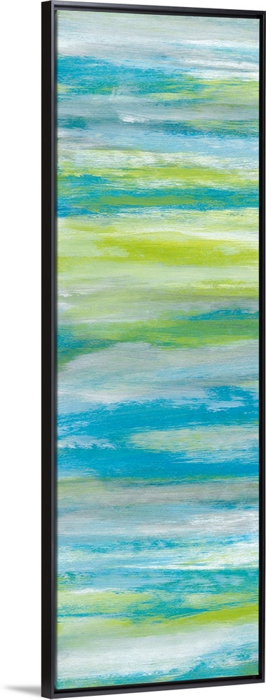 <p>A long abstract painting of bright textured colors in blue, gray and green.</p>