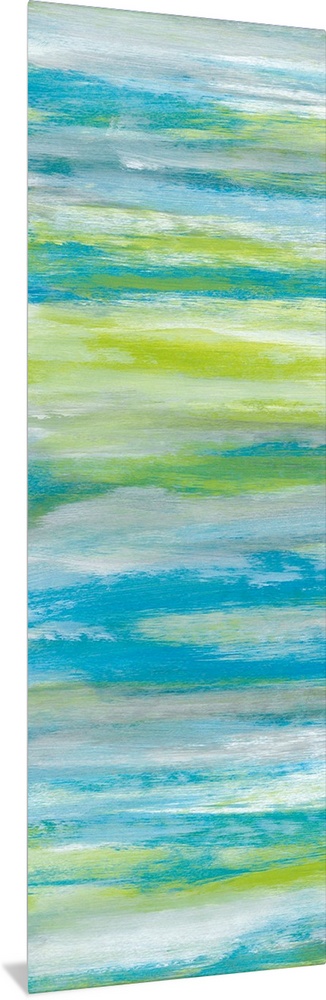 <p>A long abstract painting of bright textured colors in blue, gray and green.</p>