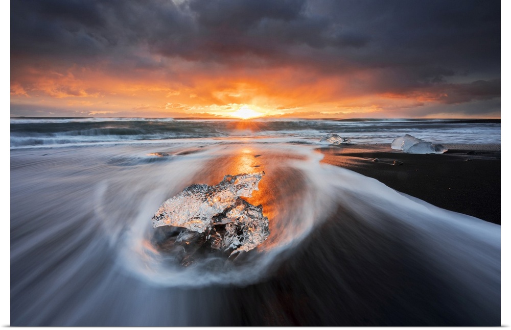 <p>Block of ice at sunrise, Jokulsarlon, Diamond beach, Austurland, Iceland.</p>