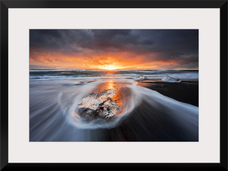 <p>Block of ice at sunrise, Jokulsarlon, Diamond beach, Austurland, Iceland.</p>