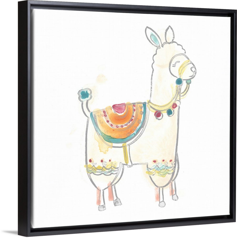 <p>This decorative artwork features an adorable llama painted with a colorful saddle and reins against a white background.</p>