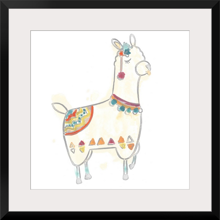 <p>This decorative artwork features an adorable llama painted with a colorful saddle and reins against a white background.</p>