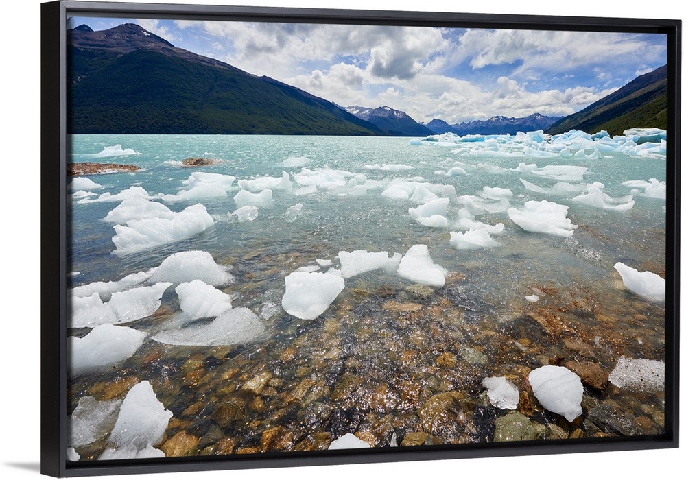 <p>Blocks of ice float in one of the affluents of Lago Argentino, next to Perito Moreno Glacier, and wash ashore before they melt, Los Glaciares National Park, UNESCO World Heritage Site, Patagonia, Argentina, South America.</p>