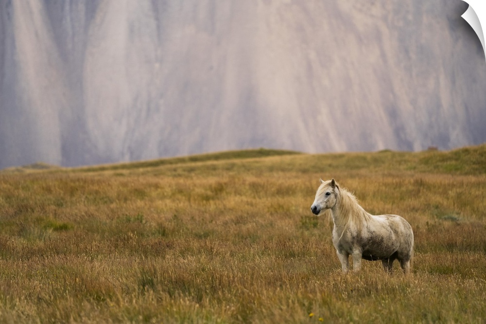 <p>Blond Icelandic horse standing in a grass field with a mountain cliff in the background, Iceland</p>