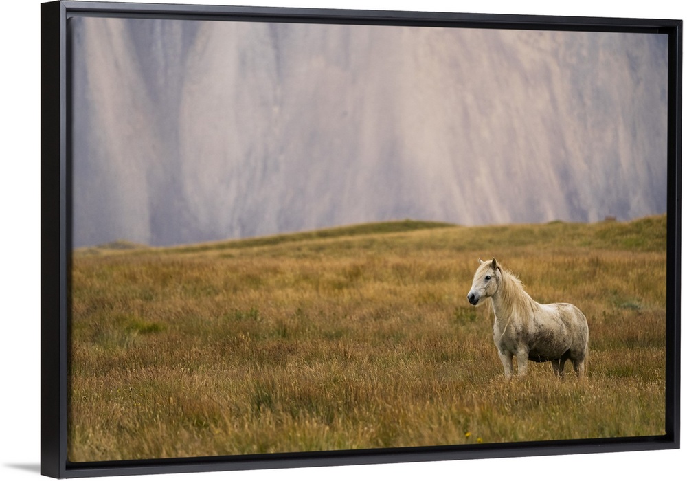 <p>Blond Icelandic horse standing in a grass field with a mountain cliff in the background, Iceland</p>