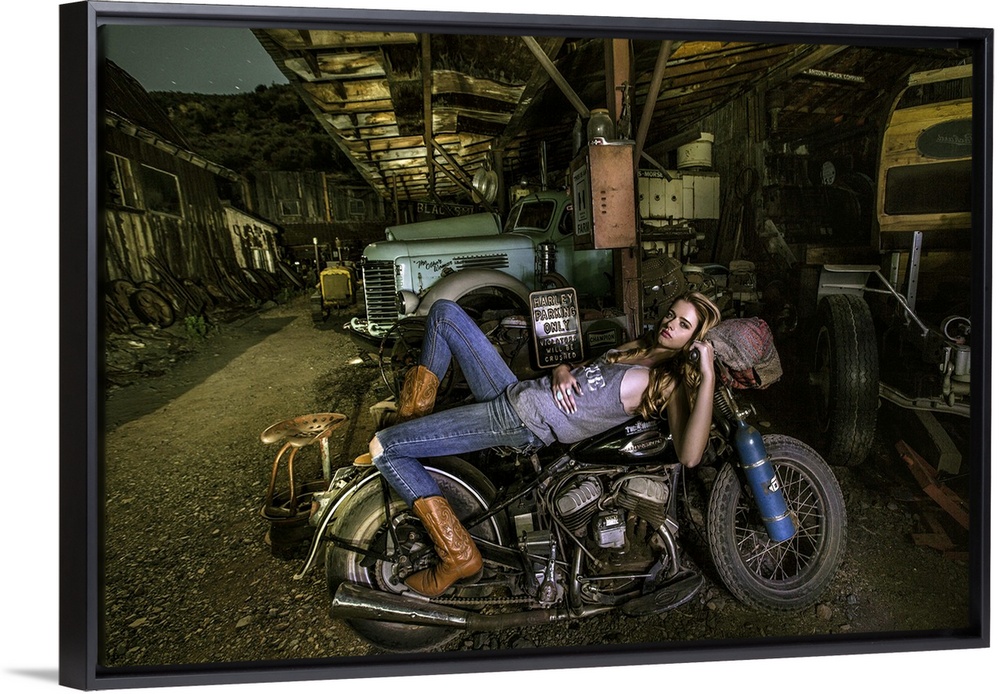 <p>Sexy blond laying on an old Harley Davidson</p>