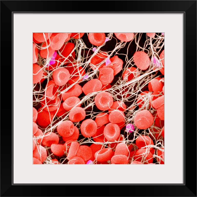 <p>Blood clot, coloured scanning electron micrograph (SEM). Red blood cells (erythrocytes) are trapped within a fibrin protein mesh (beige). The fibrin mesh is formed in response to chemicals secreted by platelets (pink), fragments of white blood cells. Clots are formed in response to cardiovascular disease or injuries to blood vessels.</p>
