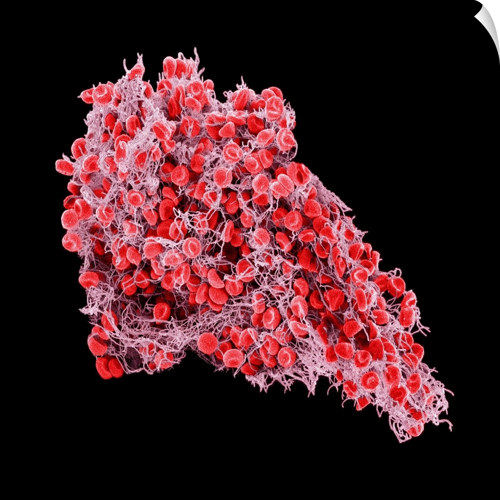 <p>Blood clot, coloured scanning electron micrograph (SEM). Red blood cells (erythrocytes) are trapped within a fibrin protein mesh (light pink). The fibrin mesh is formed in response to chemicals secreted by platelets (bright pink), fragments of white blood cells. Clots are formed in response to cardiovascular disease or injuries to blood vessels.</p>
