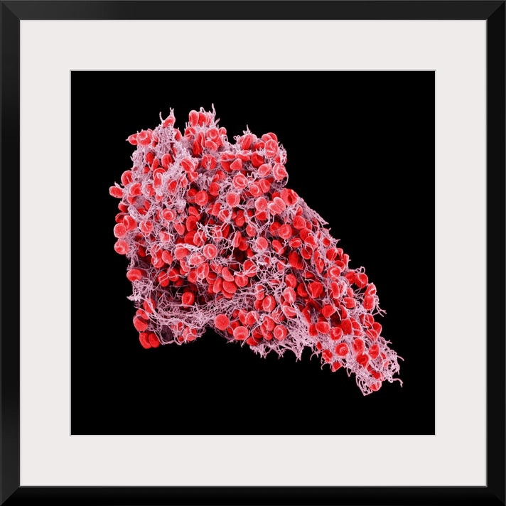 <p>Blood clot, coloured scanning electron micrograph (SEM). Red blood cells (erythrocytes) are trapped within a fibrin protein mesh (light pink). The fibrin mesh is formed in response to chemicals secreted by platelets (bright pink), fragments of white blood cells. Clots are formed in response to cardiovascular disease or injuries to blood vessels.</p>