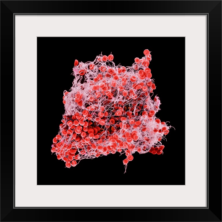 <p>Blood clot, coloured scanning electron micrograph (SEM). Red blood cells (erythrocytes) are trapped within a fibrin protein mesh (light pink). The fibrin mesh is formed in response to chemicals secreted by platelets (bright pink), fragments of white blood cells. Clots are formed in response to cardiovascular disease or injuries to blood vessels.</p>