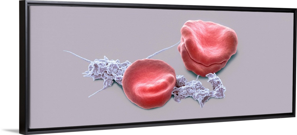 <p>Human red blood cells and platelets. Coloured scanning electon micrograph (SEM) of human erythrocytes (red blood cells) and a platelet aggregate (lilac). Platelets are fragments of white blood cells that under normal circumstances are small and biconcave in form. However, if there is a break in the surface of a blood vessel the platelets come into contact with molecules they are not used to and become activated. They become amorphous in form, with long projections (pseudopodia) that help them adhere to other cells and each other, forming a clot. Magnification: x3000 when printed at 10 centimetres wide.</p>