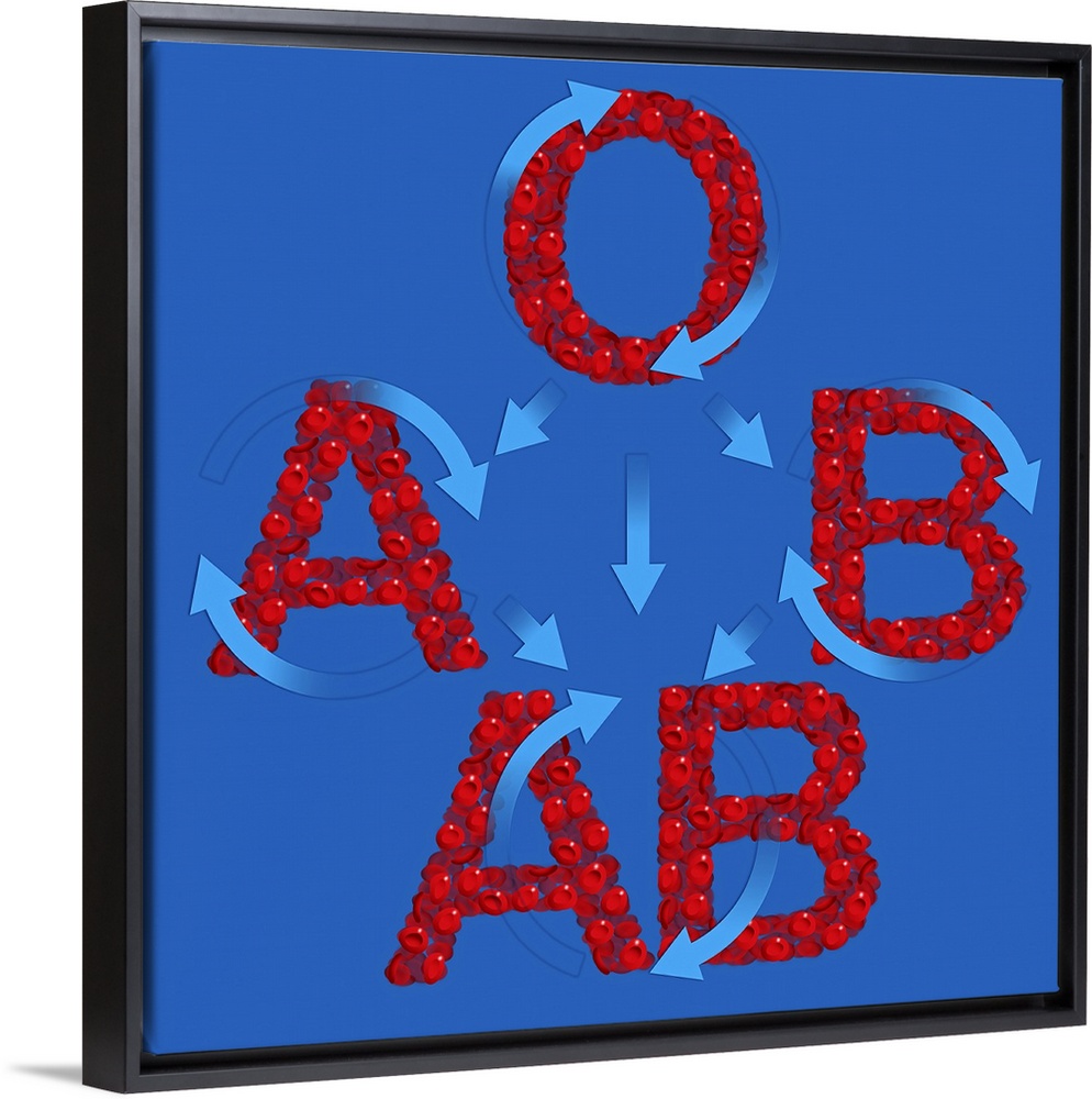 <p>Blood groups. Computer artwork of red blood cells (erythrocytes) in the shape of the letters A, B, AB and O. This represents the four different blood groups, which are determined by the presence or absence of carbohydrate molecules (antigens) on the surface of red blood cells. There are two types of blood group antigen; A and B. The lack of any antigen gives blood group O. If an incompatible blood type is given during a transfusion it can cause fatal immune reactions.</p>