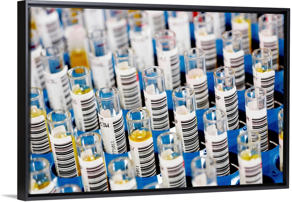 <p>Blood samples in a haematology laboratory. The vacutainers are barcoded so that these samples of donated blood can be easily identified throughout their analysis.</p>