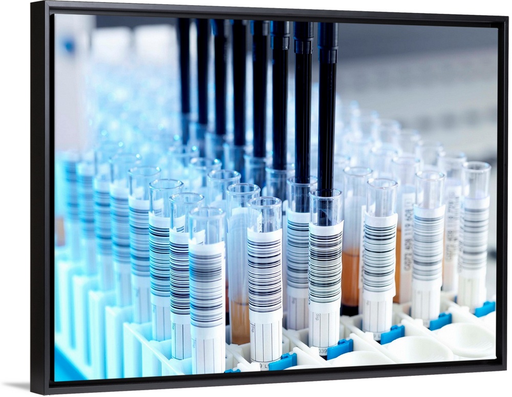 <p>Blood screening. Blood plasma samples being dispensed by an automated sample handler. They will undergo nucleic acid amplification testing (NAT) for the human immunodeficiency virus (HIV) and the hepatitis C virus (HCV). This is done by amplifying the RNA (ribonucleic acid) present so that specific genes (sections of RNA) unique to the individual viruses may be detected. This test can be used earlier than an antibody test, which requires an immune response before the test will show up positive for an infection.</p>