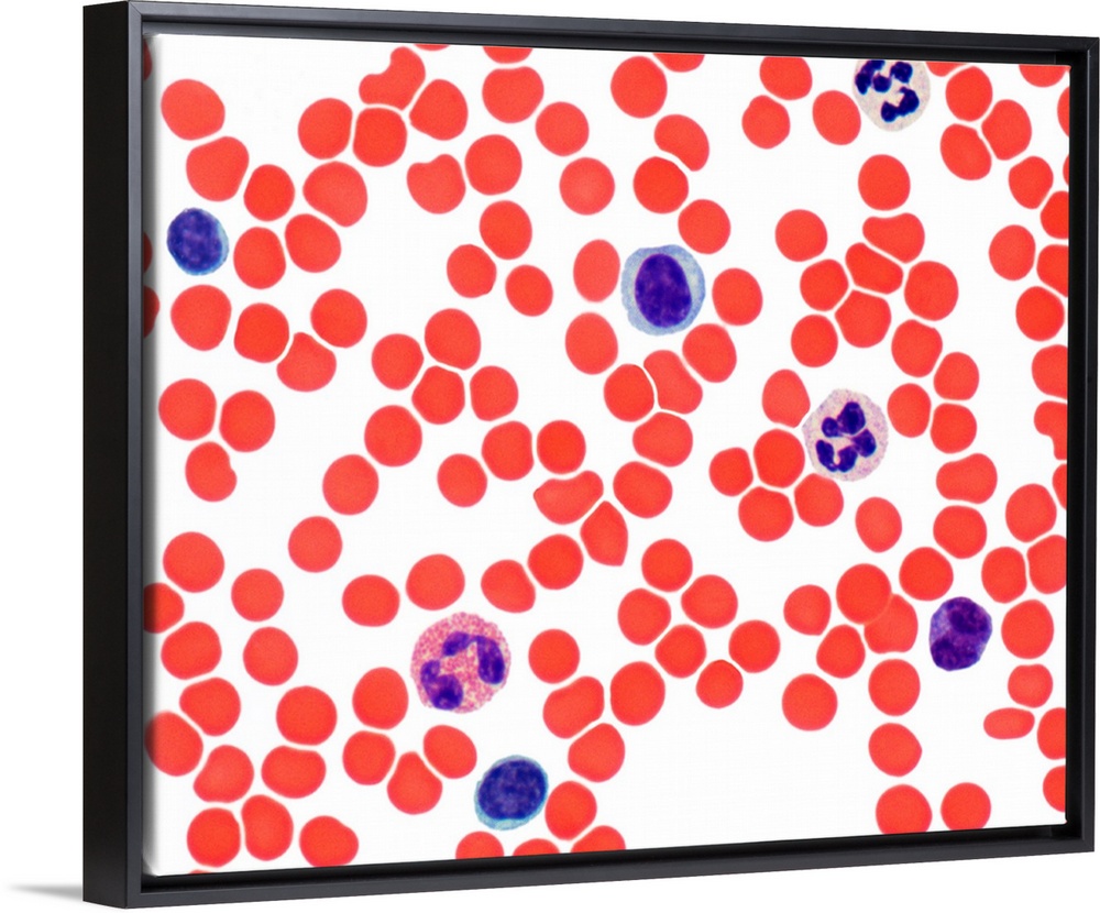 <p>Blood smear. Light micrograph showing normal red and white blood cells. At upper centre is monocyte, at top right and centre right are neutrophils, at bottom right is a basoophil, at bottom centre and top left are lymphocytes and at lower left is an eosinophil (pink cytoplasm and purple nucleus). Magnification: x500 when printed at 10 centimetres wide.</p>