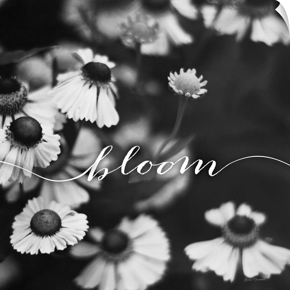 <p>Handlettering in white across a black and white photograph of flowers.</p>