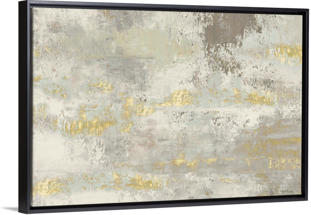 <p>A large abstract painting in textured tones of gray with gold accents.</p>