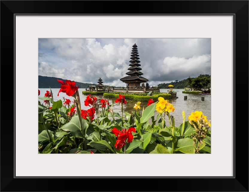 <p>Blooming flowers before the Pura Ulun Danu Bratan temple, Bali, Indonesia, Southeast Asia</p>