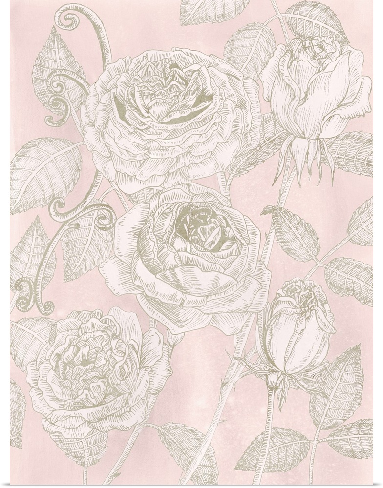 <p>This decorative artwork features illustrated roses in subdued beige and white over a soft pink background.</p>