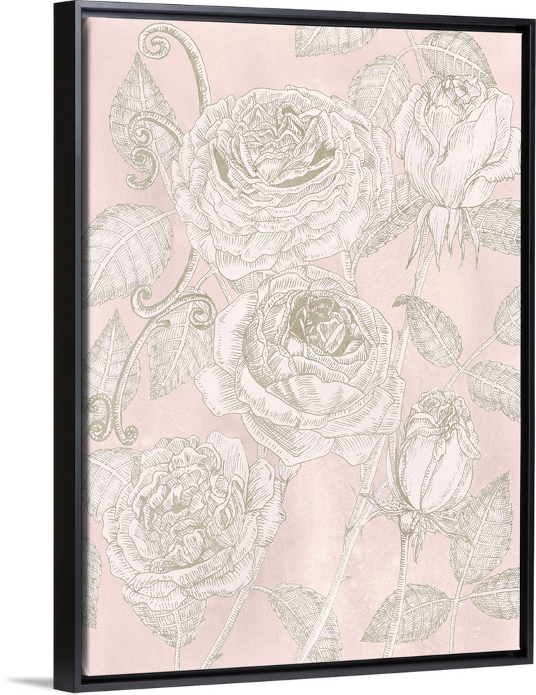 <p>This decorative artwork features illustrated roses in subdued beige and white over a soft pink background.</p>