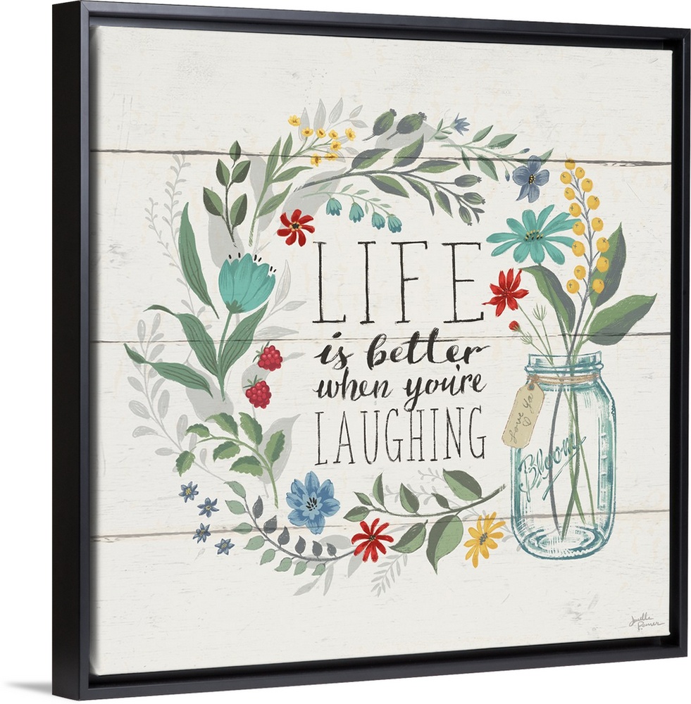 <p>"Life is Better When You're Laughing" written inside a floral wreath on a white wood paneled background.</p>