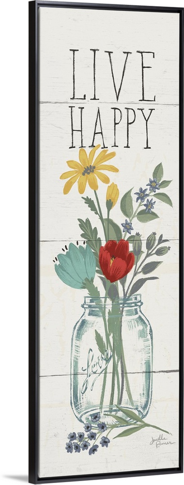 <p>Tall and skinny vertical illustration of a floral arrangement in a mason jar with the phrase "Live Happy" at the top on a white wood paneled background.</p>