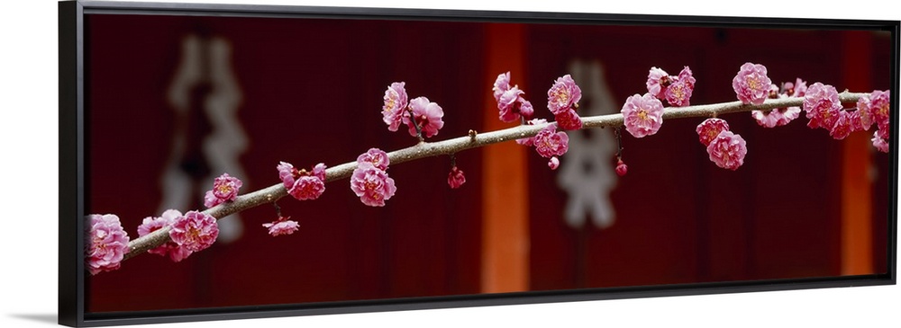 <p>A panoramic photograph of a tree covered with flower blossoms with a traditional building out of focus in the background.</p>