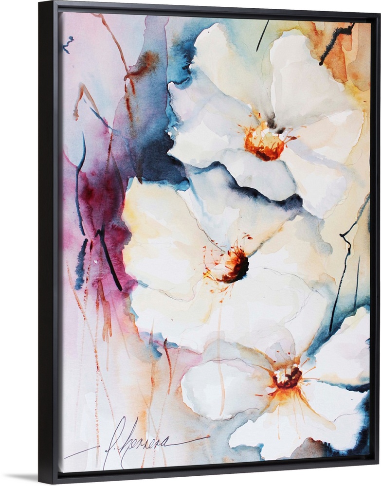 <p>Watercolor painting of white flowers against a colorful background.</p>