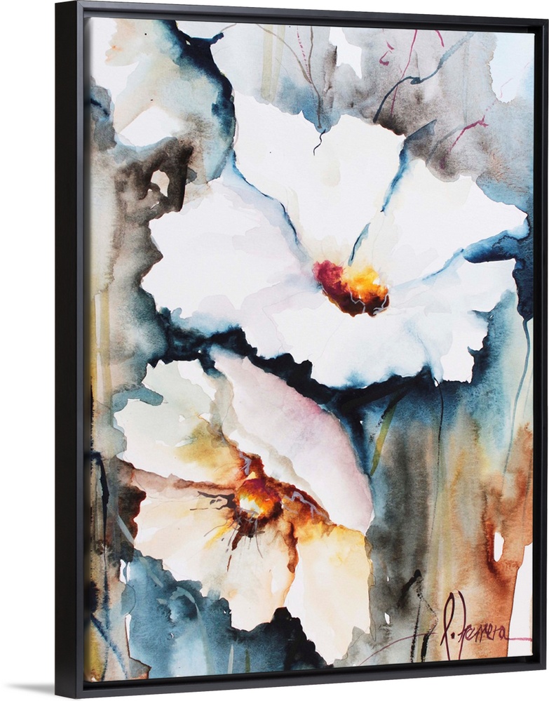 <p>Watercolor painting of white flowers against a colorful background.</p>