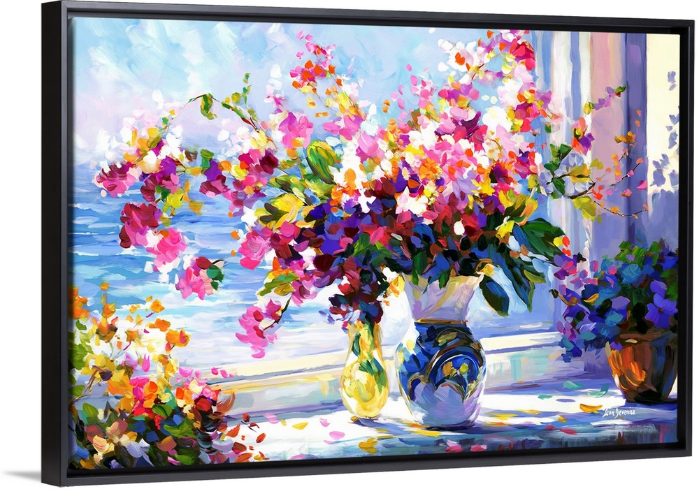 <p>In this contemporary impressionistic piece, a vase is filled with vibrant flowers, their colors standing out vividly against the tranquil backdrop of a sunlit sea, evoking the refreshing essence of a coastal morning.</p>