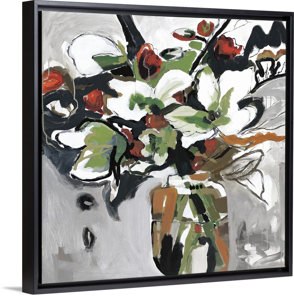 <p>Square floral abstract of a vase of large white flowers with small red roses throughout.</p>