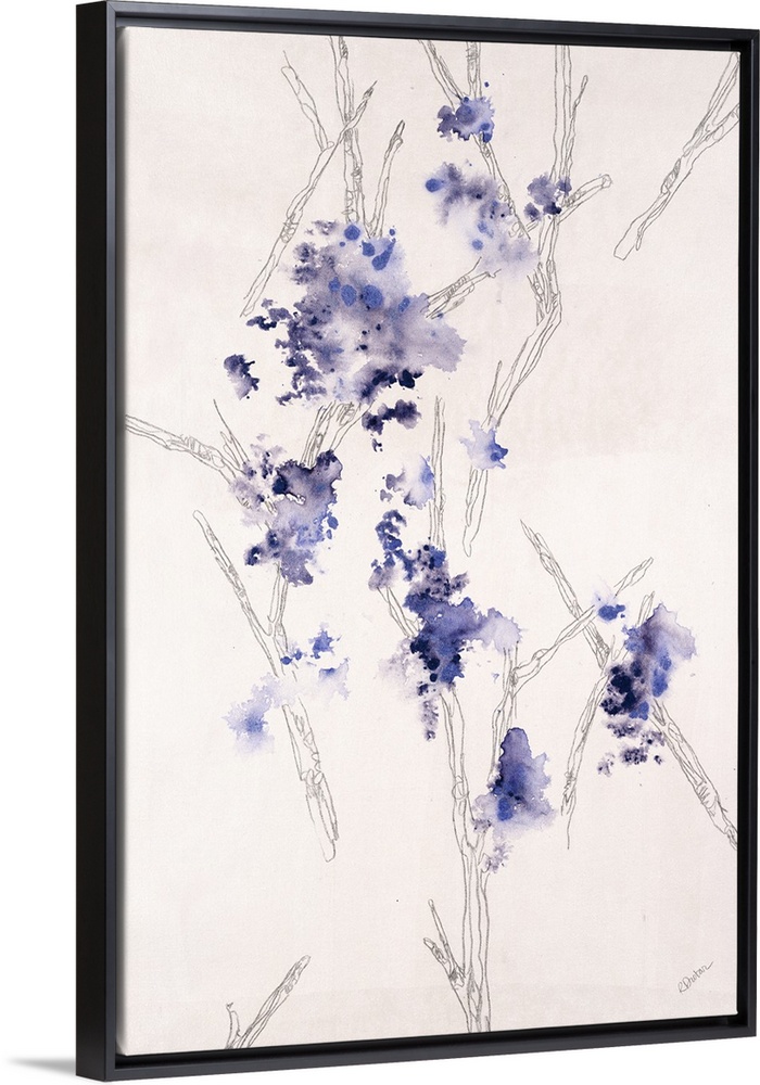 <p>Contemporary painting of a wispy branch with tiny purple flowers on it.</p>