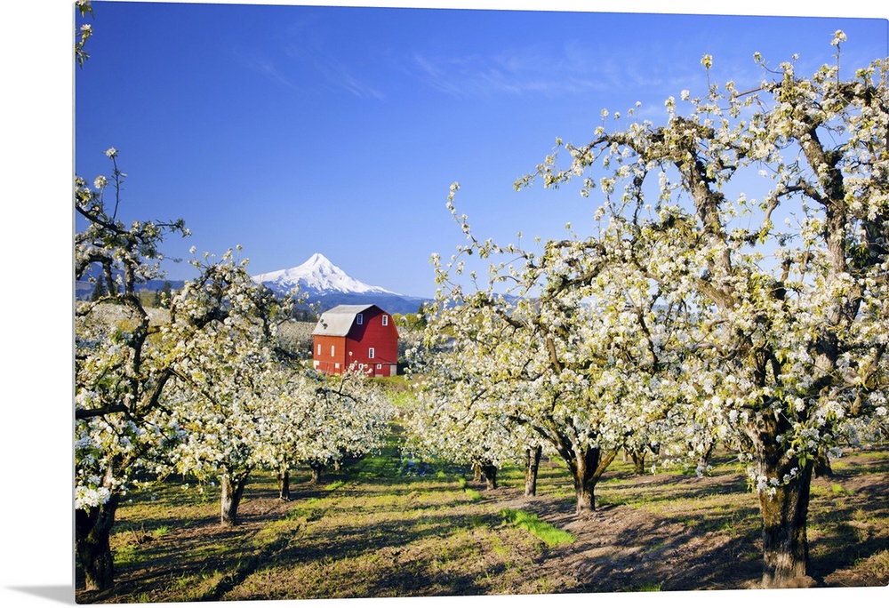 <p>04 May 2011 --- sunrise Mt.Hood and old red barn, Hood River Valley and apple blossoms, Hood River Oregon, Columbia River Gorge, Pacific Northwest. have property release on file. --- Image by Craig Tuttle/Corbis</p>