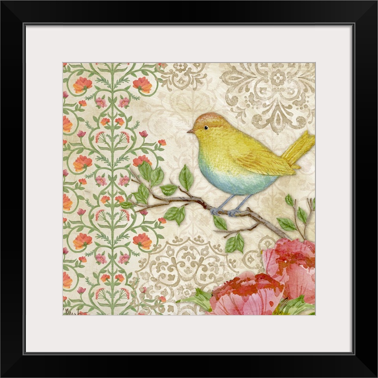 <p>Contemporary decorative artwork with a floral and vine design with a songbird.</p>