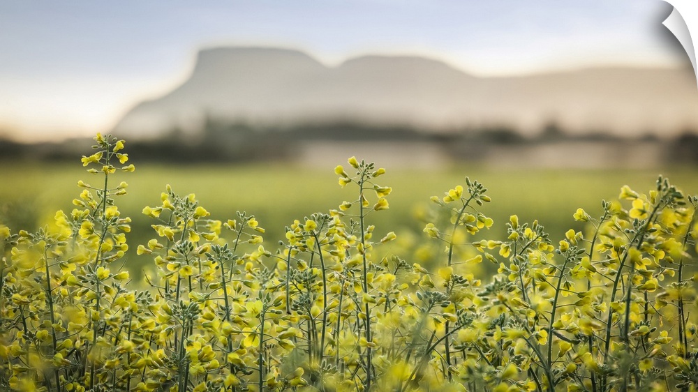 <p>Close-up of blossoming canola (Brassica napus) in a field at sunset with mountains in the distance; Thunder Bay, Ontario, Canada</p>