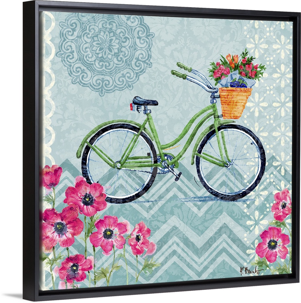 <p>Decorative panel of a vintage bicycle with a basket of flowers on a textured background and flowers on the edges.</p>