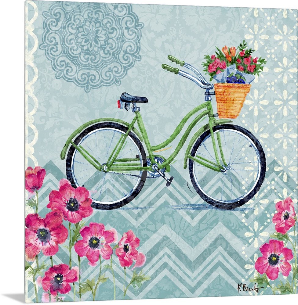 <p>Decorative panel of a vintage bicycle with a basket of flowers on a textured background and flowers on the edges.</p>